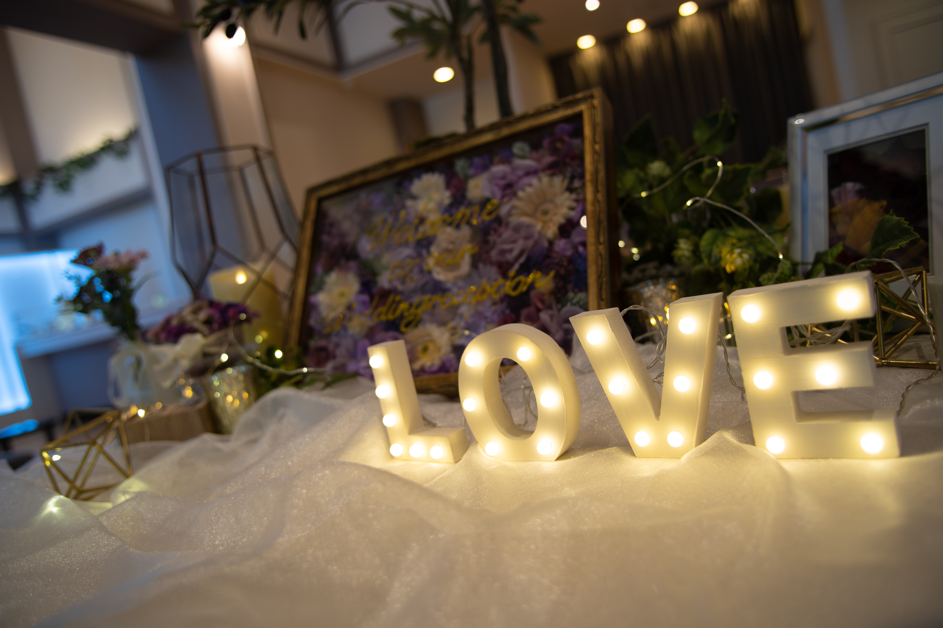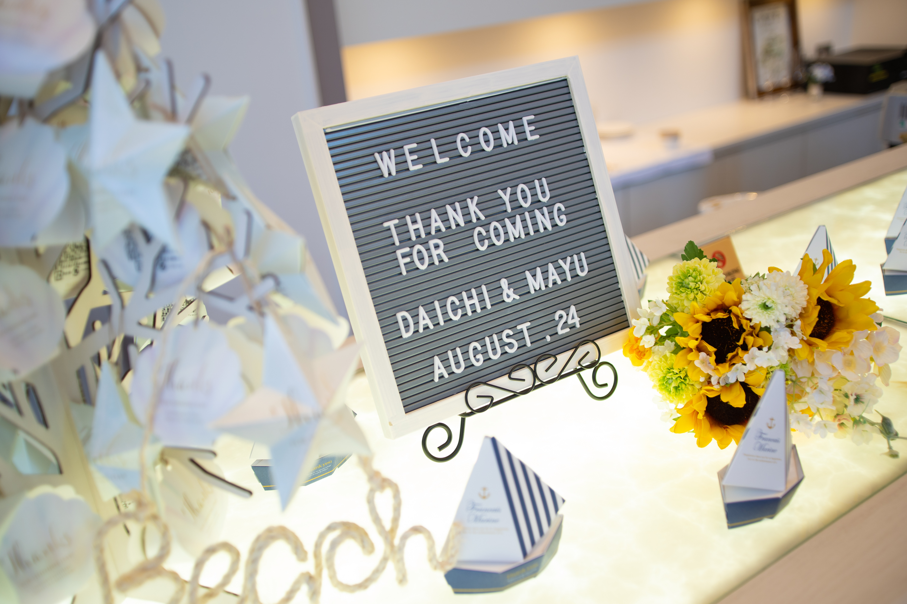 前撮りのグッズやガーランド・イニシャルオブジェなどウェルカムスペースのアイテムも手作りをしていただき、どのグッズもとても可愛くて素敵でお二人の雰囲気にピッタリでした。